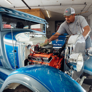 Nowhere is the Tanner’s style more apparent than David’s body shop Coler Street Auto Body where he turns out incredible work on his own rides as well as customers’ creations. The building was built around 1936 as a Coca Cola bottling factory. Typical SW Missouri river rock face wall construction has stood the test of time and goes hand in hand with David’s style and personality. The building has served as a gas station garage in the past and has been in its current configuration as Coler Street Auto Body for 11 years. Although David does collision repair like most shops, that doesn’t light the smile on his face like the hot rod projects he turns out when he gets a chance.